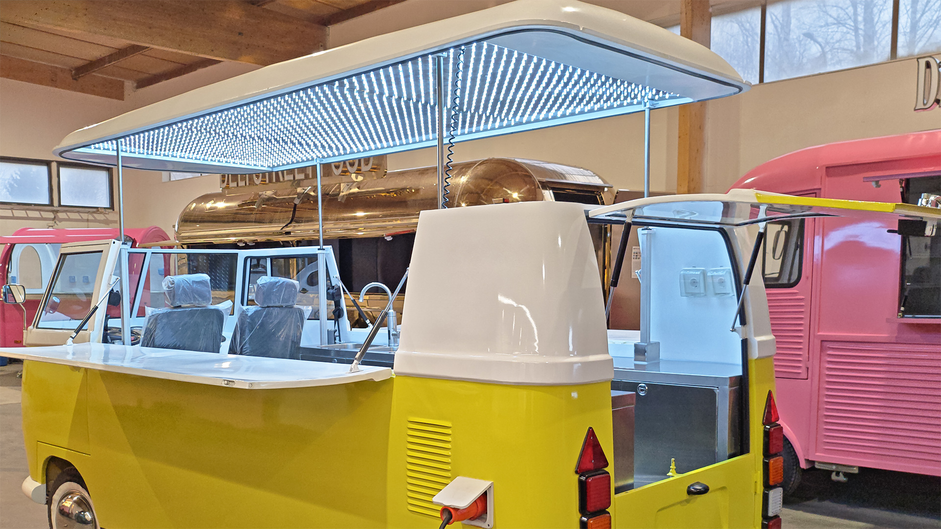 Retro Series trailers are showy and fun eyecatchers. Our trailers can take the form of a classic French van, a German minivan, an American truck, or an old American sales car.